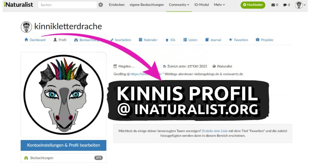 Die App iNaturalist ist eine kostenlose Plattform (App und Website), mit der wir Tiere, Pflanzen, Pilze und andere Lebewesen in unserer Umgebung beobachten, bestimmen und teilen können. Rosi Riesenfuß hat ebenfalls einen Account bei iNaturalist. Mit dem Spitznamen „Kletterdrache Kinni“ dokumentiert sie Flora und Fauna im Siebengebirge und überall, wo sie daran denkt. Gerne erkläre ich euch, wie unsere Krimi-Crew die App nutzt: